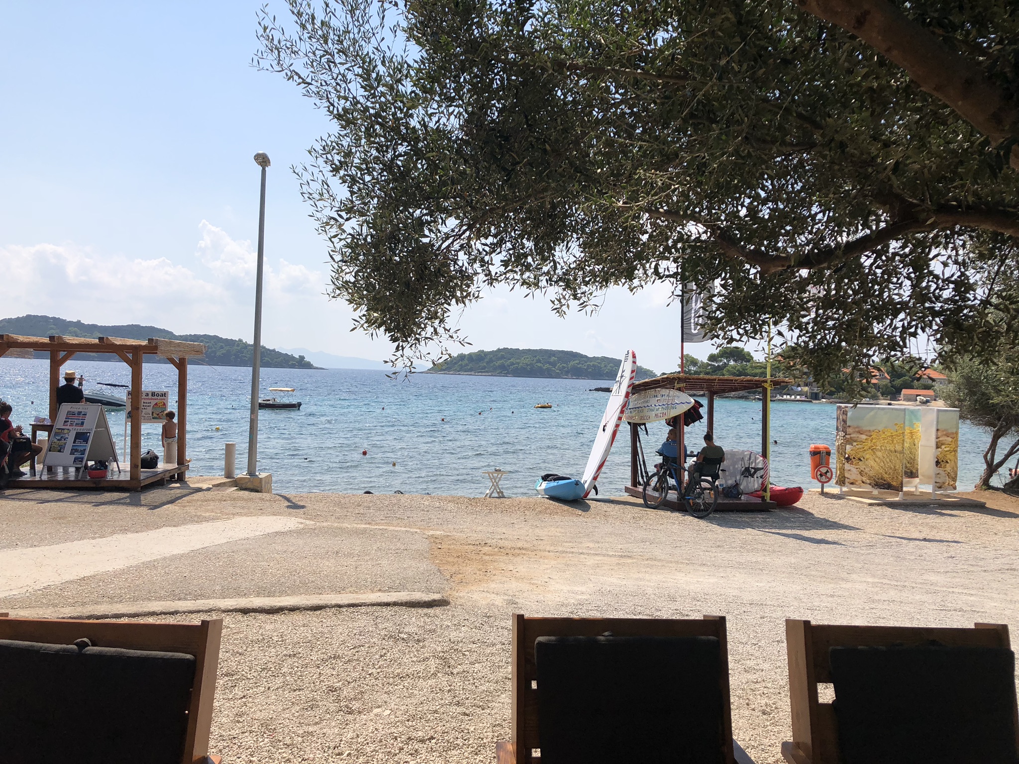 Korkula es una opción magnifica si os gusta el mediterráneo como era, poco masificado, con cantidad de calas rocosas para descubrir, y sin aglomeraciones en agosto. En la foto se ve un grupo de islas frente a la casa y decidimos que la próxima mañana alquilariamos un bote para recorrerlas. Y así lo hicimos, la misma señora de la casa en la que estabamos, vivía un piso más arriba del nuestro, nos dijo que a unos 200 metros había un sitio de alquiler, junto a un camping que está en un campo de olivos.