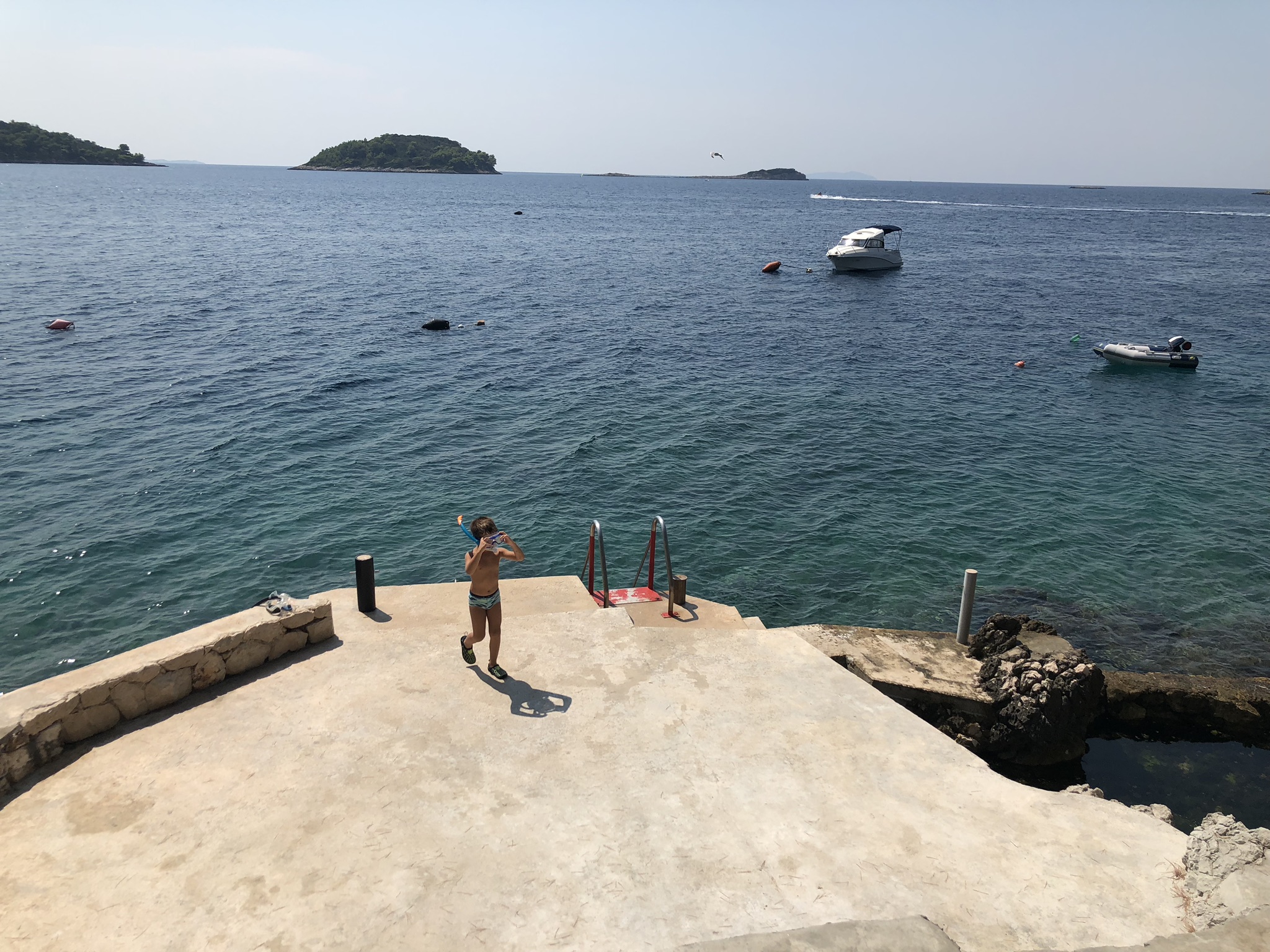 Estabamos en la mitad de nuestro viaje y tomamos la decisión de quedarnos todo el día disfrutando de estas impresionantes vistas y bajando a nuestra zona de playa, como la costa es tan rocosa han hecho una especie de embarcaderos de hormigon y cada grupo de casas comparte un trozo, el que nos correspondia lo veis en la foto de abajo.