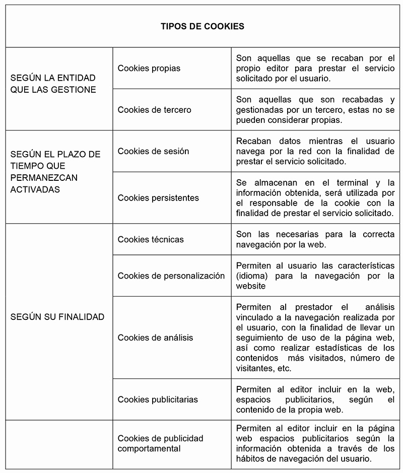 La información que le proporcionamos a continuación, le ayudará a comprender los diferentes tipos de cookies:
