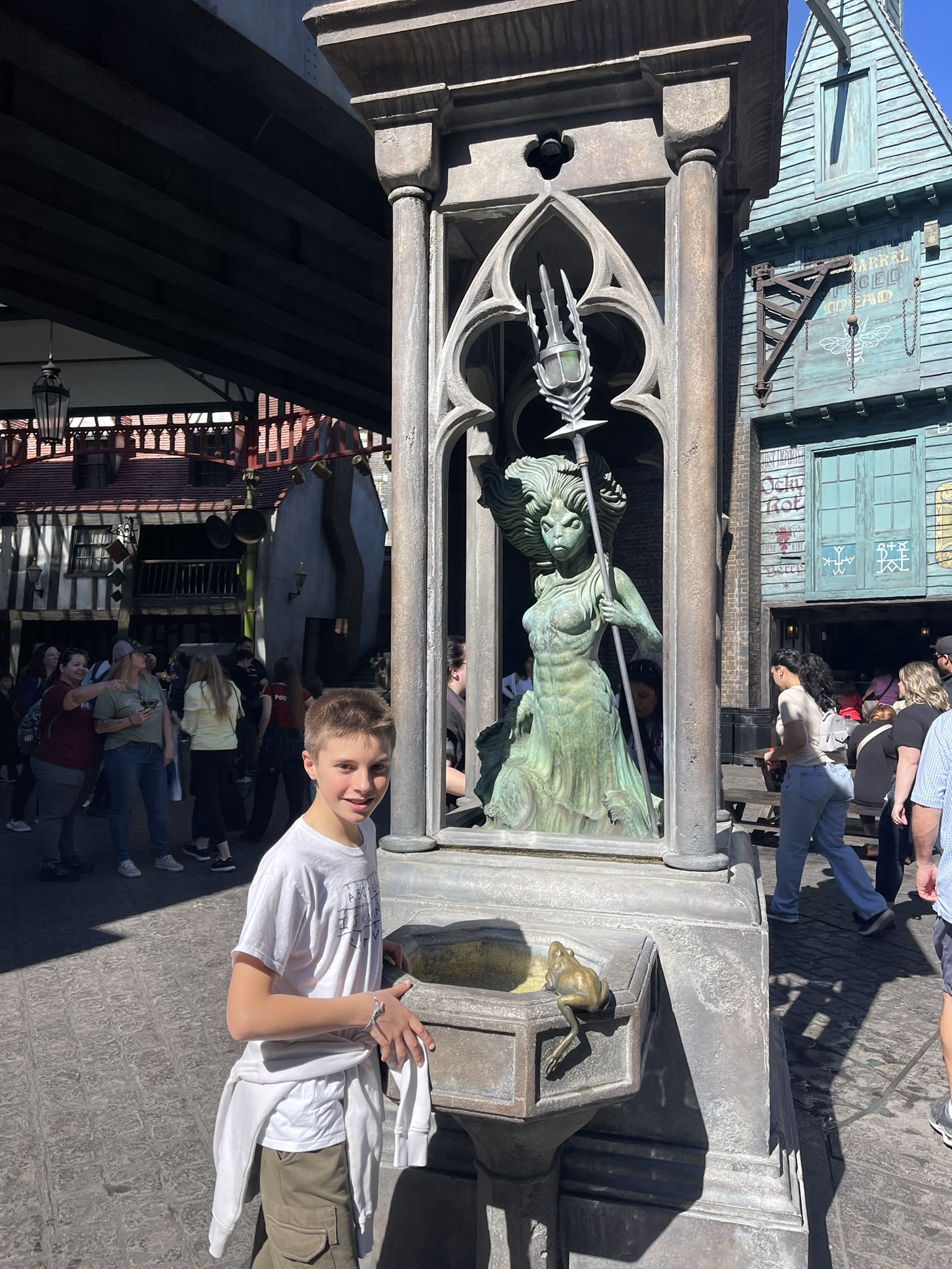 Siguiendo el recorrido nos unimos a Gru y la pandilla de Minions, de ahí al mundo mágico de Harry Potter por la entrada al callejón Diagon con el caldero chorreante y el dragón, una tontería que agrupa a todo el mundo para ver la bocanada de fuego del dragón en las horas en punto.